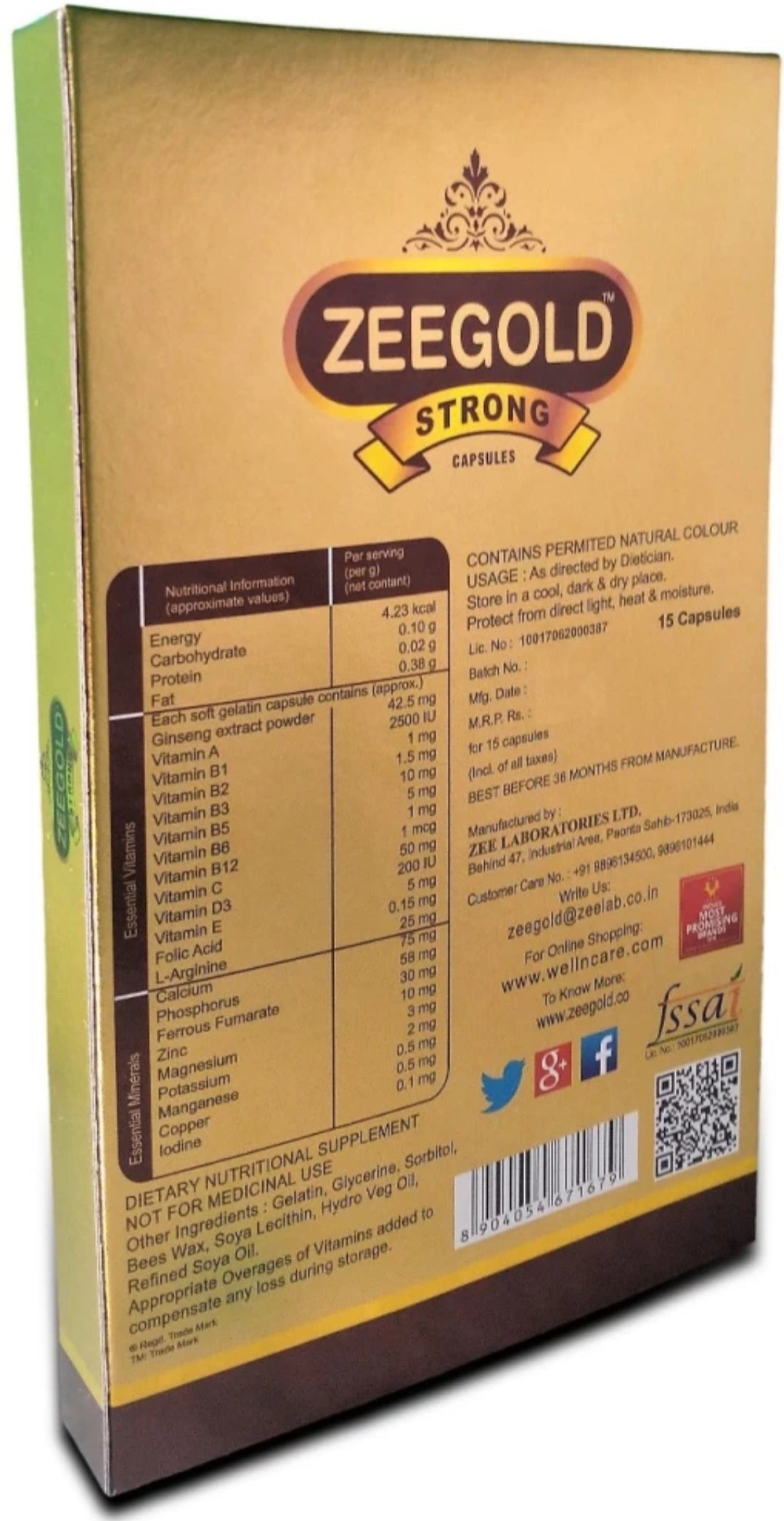 These nutritional supplement capsules with strong power of l-arginine minimizes erratic eating habits and odd sleeping hours, causing weakness, tiredness and fatigue. Hence, we need extra nutrition in the form of zee gold strong. It's 9 minerals make us strong while 11 vitamins and ginseng keep us fit and active.