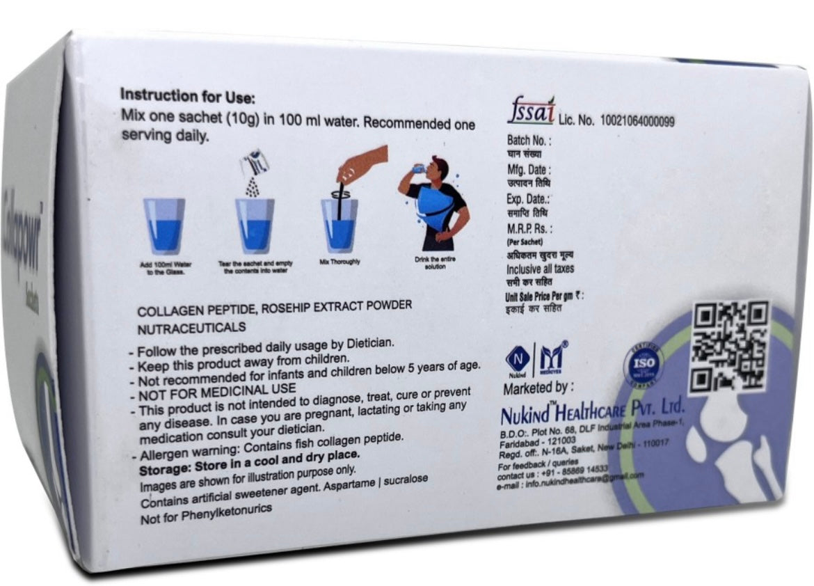 - High quantity of collagen peptide in each serving. Each 10gm of sachet contain 8gm Hydrolysed marine collagen peptide.