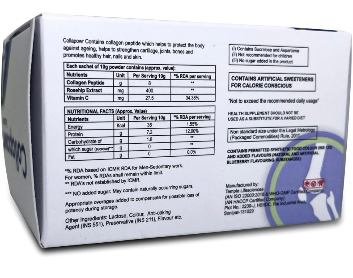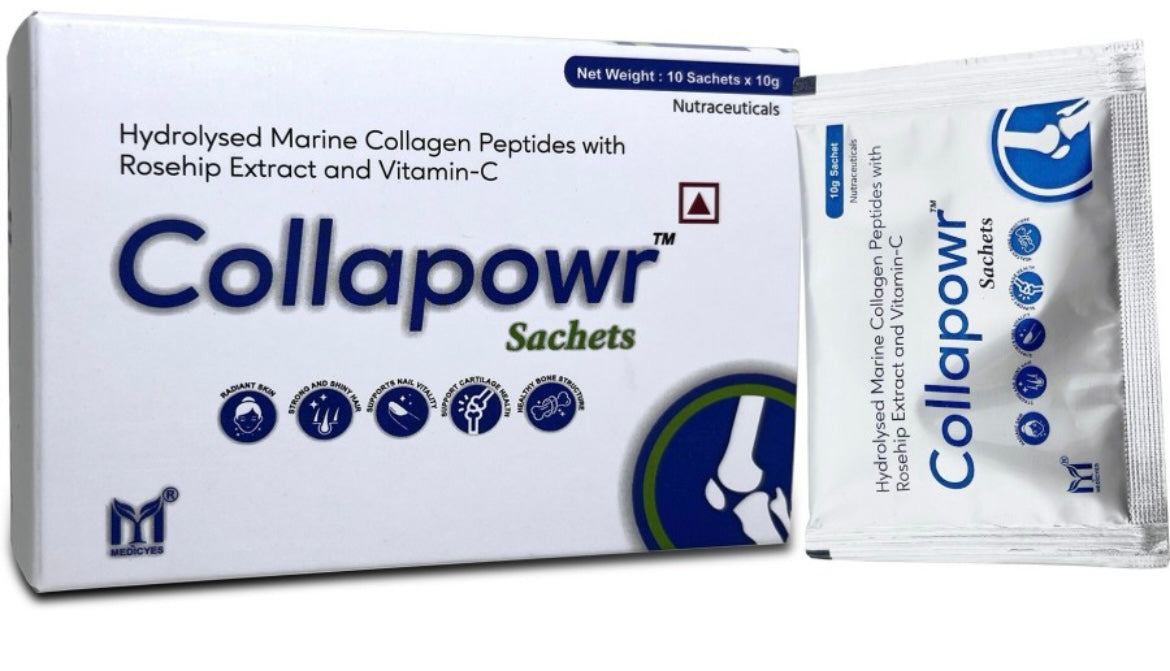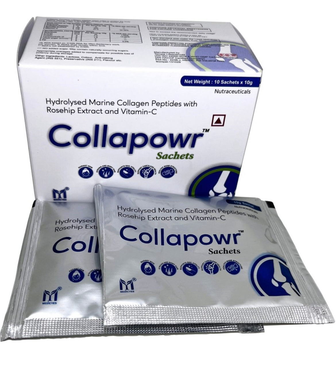 Medicyes Collapowr is a hydrolysed marine collagen peptide which is the best source of collagen and can be easly digested and absorbed in the body. Each sachet of 10gm grams contains 8gm of potent collagen peptide, so you r getting high quantity of collagen peptide in each serving. It also contains rosehip extract and vitamin C which act as an anti aging ingredients.